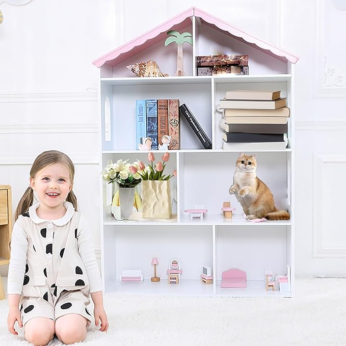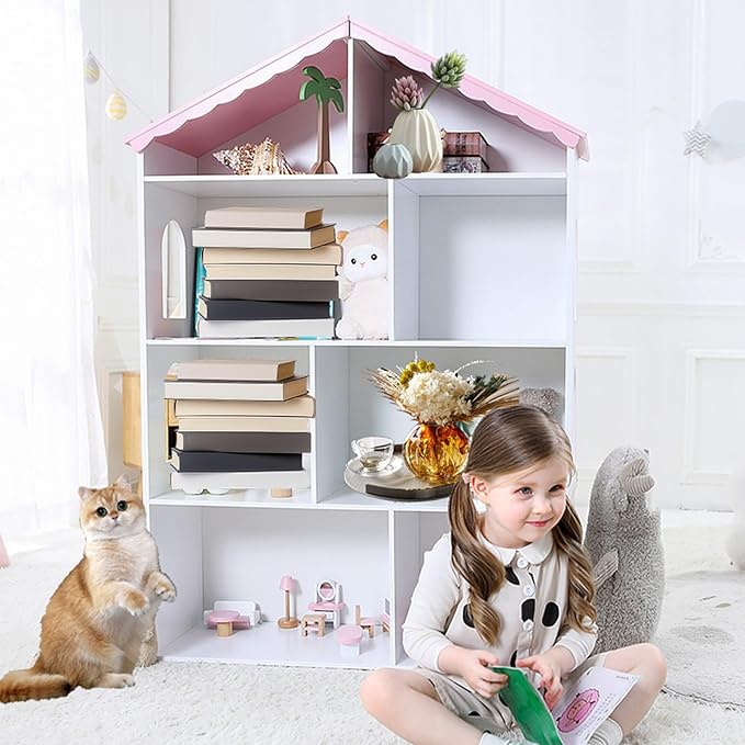 - Sparks Imagination as a 2-in-1 Dollhouse & Bookshelf--More than just a bookcase! The adorable dollhouse design with a cute window and pink roof transforms storage time into creative play. Kids can enjoy storytelling adventures while organizing, making clean-up a fun and engaging activity they’ll love.