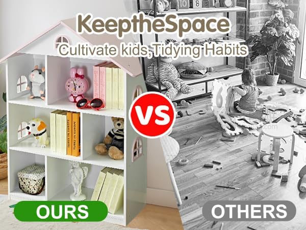 - 2. 3-in-1 Multifunctional Organizer: Bookshelf, Dollhouse & Toy Storage-- Maximize space and fun! This unit functions as a bookcase for storybooks, a storage organizer for toys and bins, and a charming dollhouse for imaginative play. Its 3-tier design with 6 compartments helps sort everything neatly, teaching organization skills.