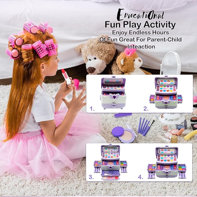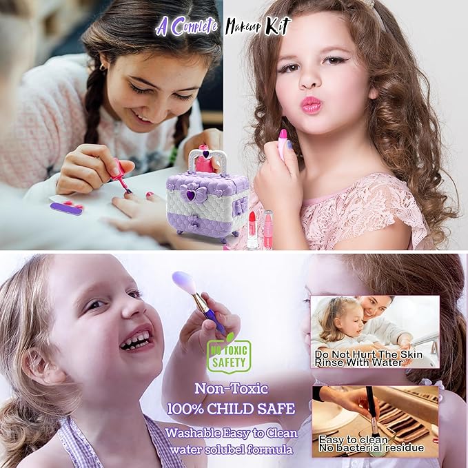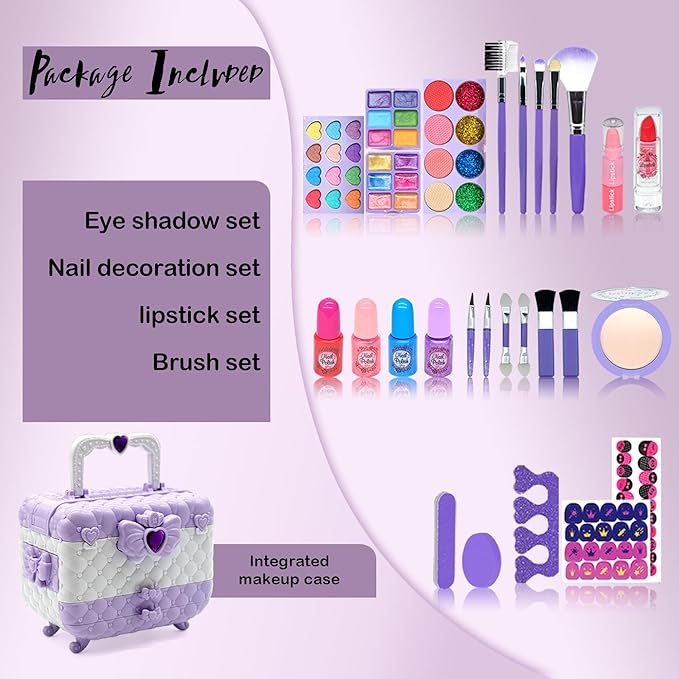 - Kids Makeup Sets For Girls :This contain Kids Makeup Sets For Girls 3-4& accessories covering eye shadow, blush, lipstick, nail polish, foundation, makeup brush, nail file, nail separator, nail stickers, 4 eyeshadow and blush palettes with 32 colors, brush-makeup sponge-etc.kids makeup kit for toys for girls 3 4 5 6 7 8 9 10-12 year(purple)