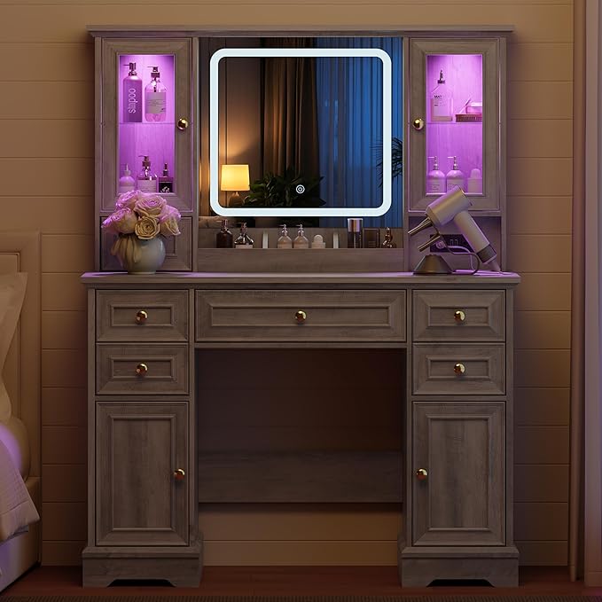 - Large Storage Capacity with Smart Layout – Measuring 43.22"W × 15.75"D × 55.43"H, this vanity desk includes 6 drawers (1 large, 4 small, 1 tabletop drawer), 2 glass-door cabinets, 2 spacious cupboards, and 3 open makeup trays. Store cosmetics, perfumes, skincare, and accessories neatly and accessibly—keeping your makeup vanity desk organized and stylish.