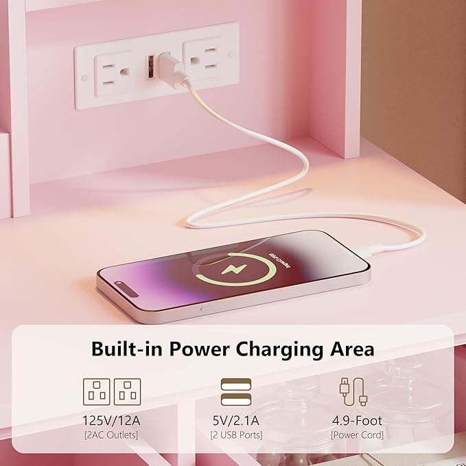 - Built-in Power Outlets for Convenience – Designed for modern lifestyles, this makeup vanity features 2 AC outlets and 2 USB ports, allowing you to charge your phone, tablet, or styling tools while you get ready. A perfect combination of elegance, functionality, and practicality for any girls vanity or dressing table setup.