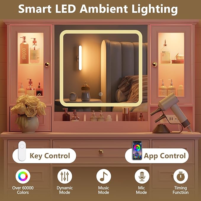 - Large Storage Capacity with Smart Layout – Measuring 43.22"W × 15.75"D × 55.43"H, this vanity desk includes 6 drawers (1 large, 4 small, 1 tabletop drawer), 2 glass-door cabinets, 2 spacious cupboards, and 3 open makeup trays. Store cosmetics, perfumes, skincare, and accessories neatly and accessibly—keeping your makeup vanity desk organized and stylish.