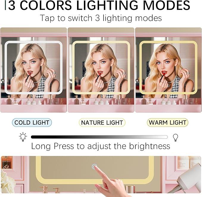 - Brilliant LED Mirror with Adjustable Lighting – Equipped with built-in LED lights, this makeup vanity offers stepless brightness control and three color modes (Warm, Natural, Cool). Whether you’re getting ready for work, a date night, or a special occasion, this makeup table provides the ideal lighting for flawless makeup application.