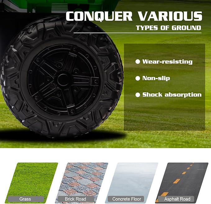 - [Outstanding Performance] Equipped with a 24 volt strong battery, our tires ride on truck can provide a long using time at the speed range of 2-5mph. The steering wheel, big trailer, bright LED headlights, MP3 player, shift knob and EVA tires offer a realistic driving experience. The wear-resistant wheels allow your kids to ride the car on many kinds of terrains such as grass, brick road, asphalt road and so on.