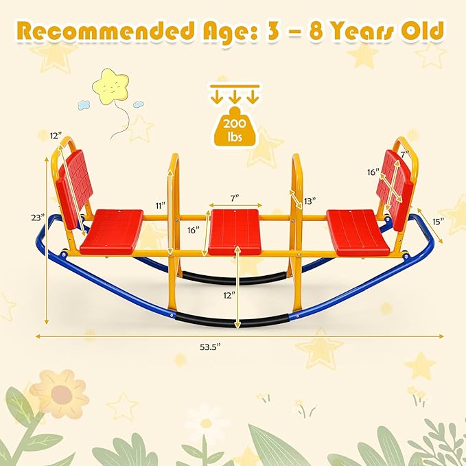 - Practical 3-Seater Design for Enhanced Social Play: Unlike traditional 2-person seesaws, the 3 person toy features three individual seats, allowing more children to enjoy the fun together. This family-friendly design promotes social interaction and sharing while providing inclusive play for siblings and friends in the backyard or playroom.