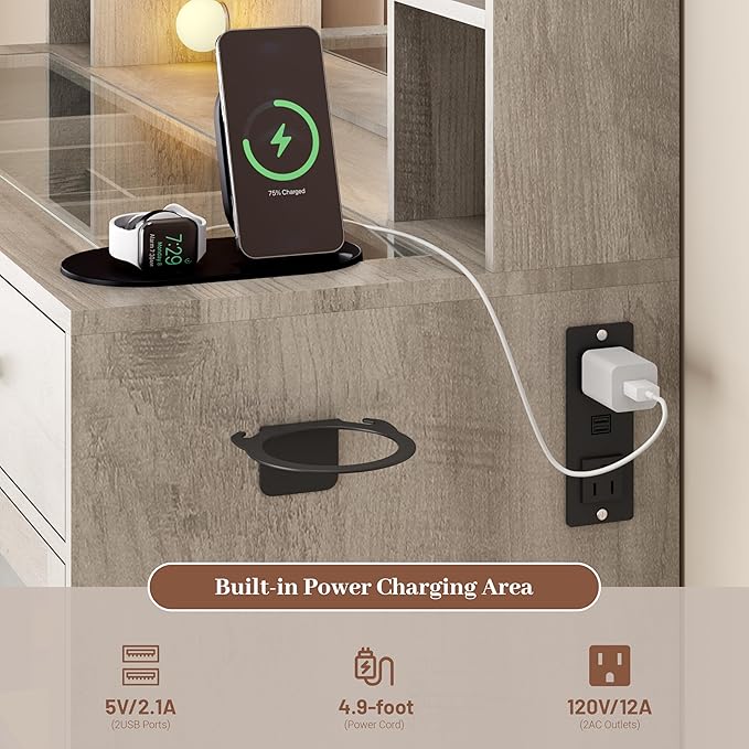 - 【Built-in Charging Station & Hair Tool Holder】 Equipped with 2 AC outlets, 2 USB ports, and a dedicated hair dryer stand, this vanity allows you to charge devices and style your hair without leaving your seat. Keep all your electronic beauty tools ready while maintaining a clutter-free tabletop.