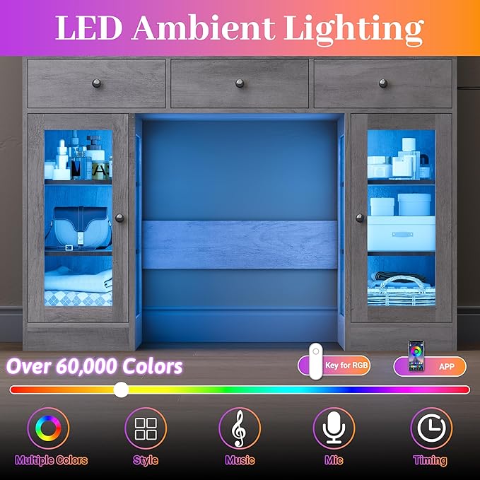 - 【Smart RGB Ambient Lighting】 Modern makeup vanity with RGB lights (available in white, black, and pink) features an advanced ambient lighting system built into the cabinets. Easily adjust the lighting through the dedicated app or the convenient button. With over 60,000 colors, dynamic lighting modes, and music sync, this vanity creates an immersive setup for daily makeup, relaxation, or social gatherings.