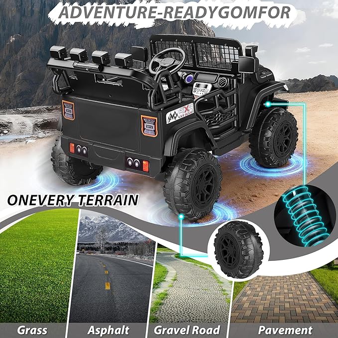- 🚙【Immersive & Realistic Driving Experience】Designed to delight, this 24V truck includes double-opening doors, 4-spring suspension, a working steering wheel, fun horn, bright LED headlights, and Bluetooth music playback—creating a truly engaging and realistic ride every time