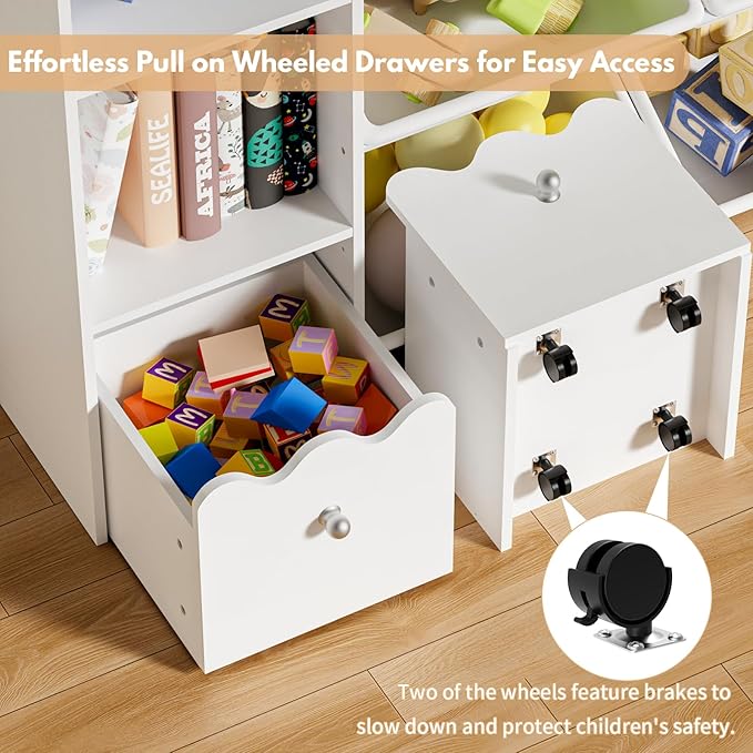 - 【Child's Personal "Toy Car"】The bottom drawer of this toys storage unit is equipped with silent casters for easy movement. Children can effortlessly drag the drawer to any corner of the room, flexibly adjusting the storage space. The smooth casters feature a brake design, ensuring stable movement without damaging the floor