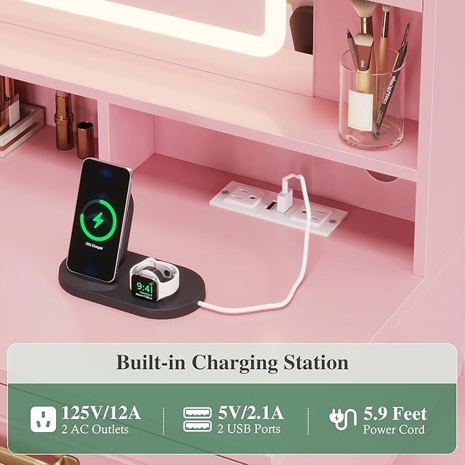 - 【Vanity Desk with Charging Station】Dressing table has a built-in charging station, equipped with 2 standard power outlet and 2 USB ports, to meet the needs of multiple electrical appliances at the same time. Whether it's a curling iron to create charming curls, a hair dryer for quick drying, or charging your cell phone at any time, it's all easy to do, convenient and efficient