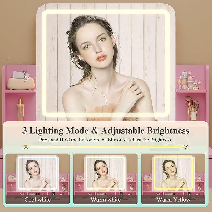 - 【Vanity Desk with 3-Color Lighting Mirror】Vanity table is equipped with LED lighted makeup mirror, the brightness is adjustable as you wish, and three lighting modes (cool white, warm white, warm yellow) to meet the needs of different scenes. Just press the touch switch, you can easily find the most comfortable light, which helps create a more delicate and satisfying makeup look
