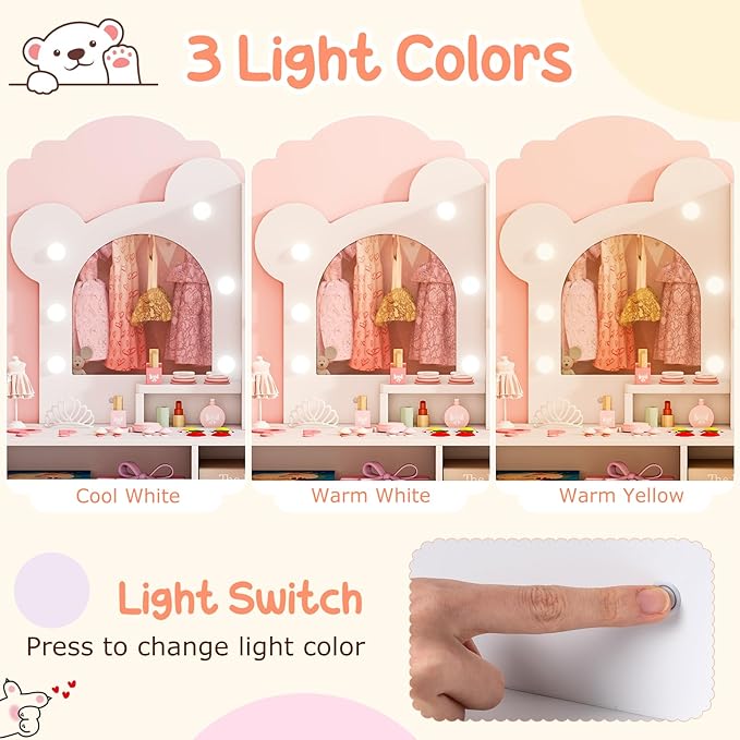 - Charming 3-Color Lighted Mirror: This kids vanity set features an LED lighted mirror, offering 3 colors including cool white, warm white and warm yellow. Its brightness can also be adjusted by long pressing the button. Note: 3 AA batteries are required (not included).