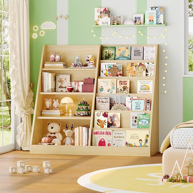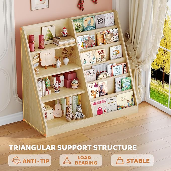 - 【Child-Friendly Design with Montessori Principles】Featuring a child-friendly 33.47in height and a stable triangular structure, this wooden Montessori bookshelf enables independent access. Toddlers can safely reach and return items themselves, fostering confidence and autonomy. The rounded corner design eliminates bump risks, making this nursery bookshelf both secure and empowering for young users.