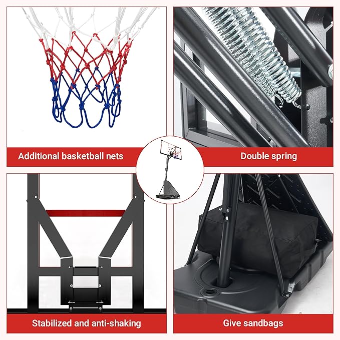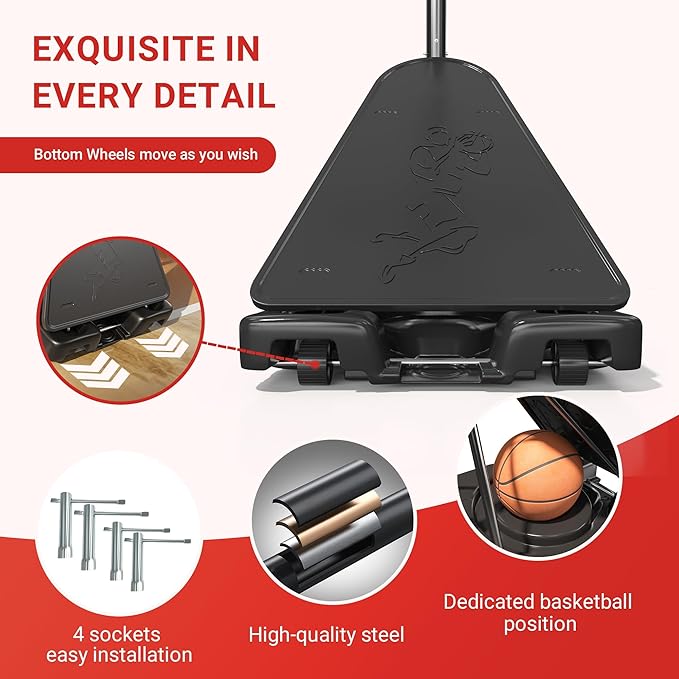 - [Enhanced Stability with Upgraded Base Design] Featuring a robust huge 44’’ x 28’’ base,larger than many same model,this basketball goal system ensures superior stability during intense play.Fill the base with water and sand for weigh up to 200lb for unmatched kids basketball goal balance and safety,even in windy harsh conditions.We have designed a unique double triangle reinforcement structure for the kids basketball hoop to provide firm stability to prevent shaking and increase stability