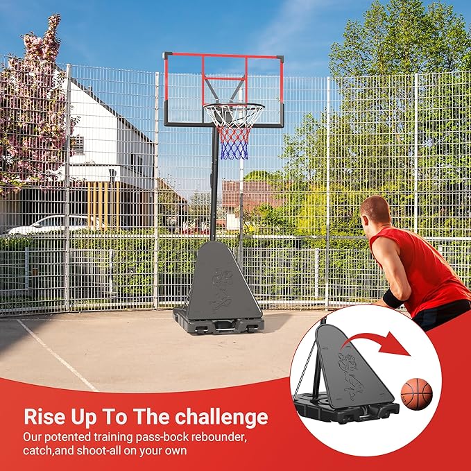 - [Portable and Versatile for Any Location] Equipped with two smooth-rolling wheels, this indoor basketball hoop system is effortlessly portable.Move basketball hoop for kids from your backyard to your driveway or even indoors for gym use.The basketball court base is also equipped with a basketball storage facility,easy to hold and access at any time.The portable basketball hoop outdoor ensures you can enjoy basketball wherever you want,whether in pool,backyard,driveway,parks,home,playground