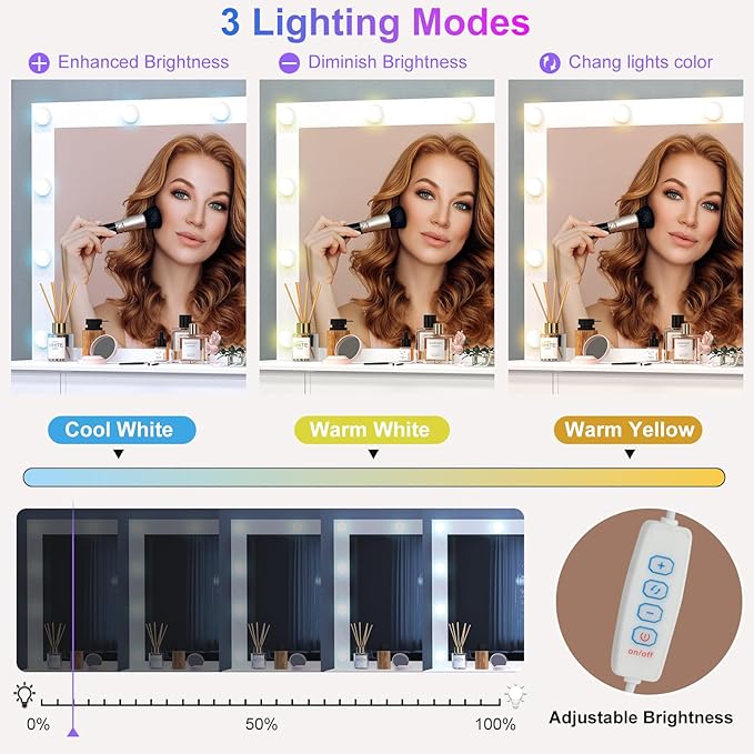 - Vanity Desk with Large Lighted Mirror: The vanity desk features large mirror with 10 LED bulbs and 3 color modes—yellow, white, and cool white, brightness adjustable, ensures perfect lighting for makeup and styling. This makeup vanity makes every moment feel special. Transform your daily routine into a luxurious self-care experience with this modern vanity desk