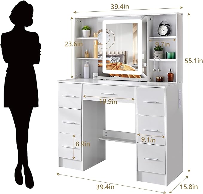 - 39.4'' W Makeup Vanity - Best Gifts Idea: This elegant vanity desk brings a fresh, airy vibe to any room, with premium handles adding warmth and sophistication. More than a functional vanity, it transforms your space into a stylish focal point that complements modern, bohemian, or classic decoration. Perfect as a gift, this vanity desk delights your wife, daughter, mother, or granddaughter on holidays or special occasions, turning everyday beauty routines into a luxurious, joyful experience