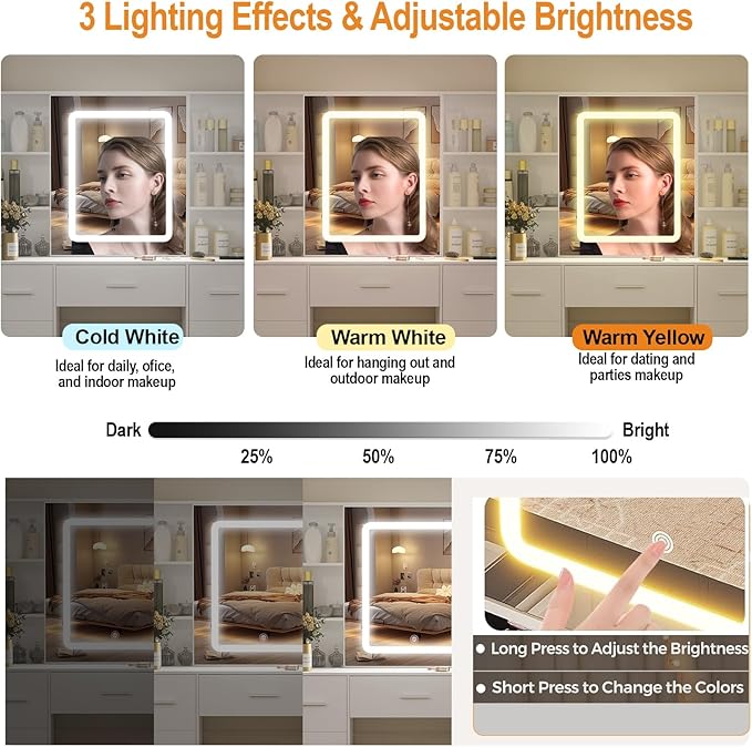 - Vanity Desk with Sliding Mirror and Lights: The vanity desk features storage behind sliding LED mirror with 3 color modes—yellow, white, and cool white, brightness adjustable, ensures perfect lighting for makeup and styling. This makeup vanity makes every moment feel special. Transform your daily routine into a luxurious self-care experience with this modern vanity desk