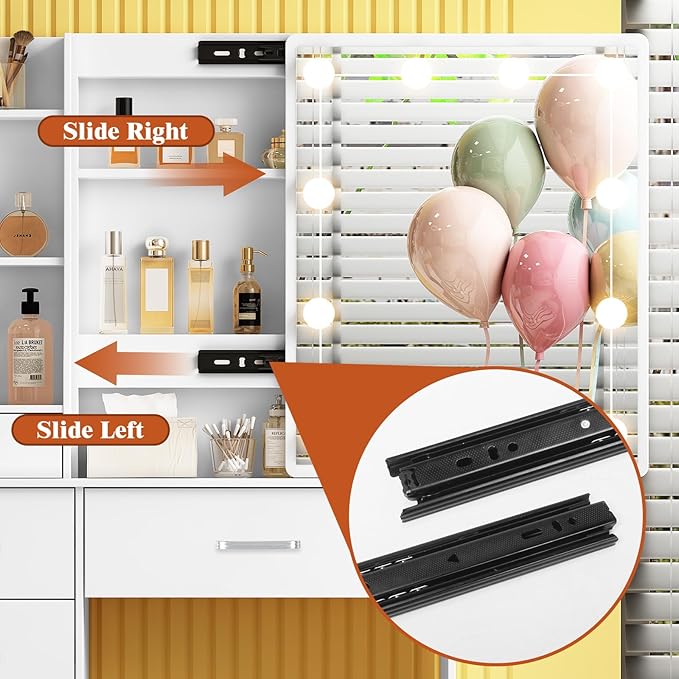 - Vanity Desk with Sliding Mirror and Lights: The vanity desk features storage behind sliding mirror with 10 LED bulbs and 3 color modes—yellow, white, and cool white, brightness adjustable, ensures perfect lighting for makeup and styling. This makeup vanity makes every moment feel special. Transform your daily routine into a luxurious self-care experience with this modern vanity desk