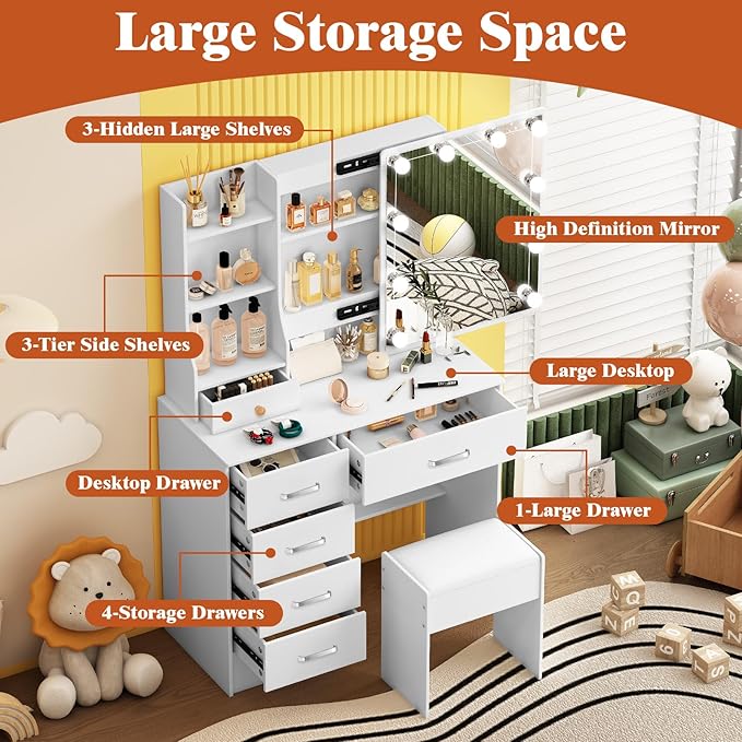 - Durable & Sturdy Vanity Desk: Crafted from premium engineered wood with thick, smooth, odor-free panels, this vanity desk ensures long-lasting durability. The reinforced structure provides stability and safety, creating a reliable vanity you can trust. Every use becomes a delightful, worry-free self-care ritual