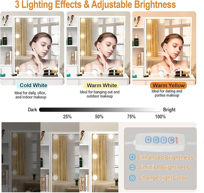 - Vanity Desk with Sliding Mirror and Lights: The vanity desk features storage behind sliding mirror with 10 LED bulbs and 3 color modes—yellow, white, and cool white, brightness adjustable, ensures perfect lighting for makeup and styling. This makeup vanity makes every moment feel special. Transform your daily routine into a luxurious self-care experience with this modern vanity desk