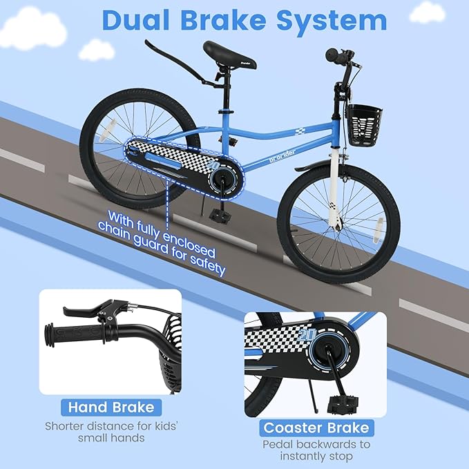 - Dual Brake System for Safety: The children’s bicycle features a hand brake with a shorter distance for kids’ small hands, as well as a rear coaster brake that allows young riders to stop by pedaling backwards. A fully enclosed chain guard protects fingers and clothing, adding extra safety during every ride.