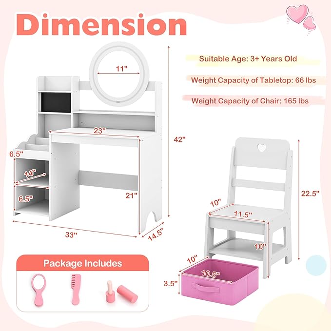- The Perfect Gift: A dream come true for little fashionistas! Its princess-style design, complete with glowing lights, makes it an unforgettable birthday or holiday gift for kids over 3+ years old. Perfect not only for pretend dressing and daily grooming, it also doubles as a table for writing, crafting, and painting, making it an ideal centerpiece for any bedroom or playroom.Table Dimension: 33" x 14.5" x 42" (L x W x H); Chair Dimension: 12.5" x 12" x 22.5" (L x W x H)
