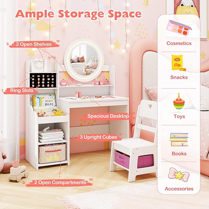 - Tidy-Up Made Fun: Say goodbye to mess! This toddler vanity desk offers a spacious tabletop along with 2 open shelves, 3 upright cubes, ring slots, and 2 open compartments below. Besides, the matching chair includes a removable fabric bin to keep all the little princess’s cosmetics and toys neatly organized.