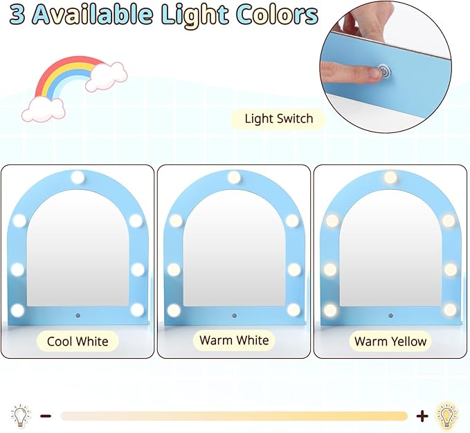- 3-Color LED Lighted Mirror: This kids makeup vanity desk features a lighted mirror that offers 3 color options: cool white, warm white and warm yellow. It also allows adjustable brightness by long pressing the button, creating personalized lighting to suit different moods. Please note that 3 AA batteries are required (not included).
