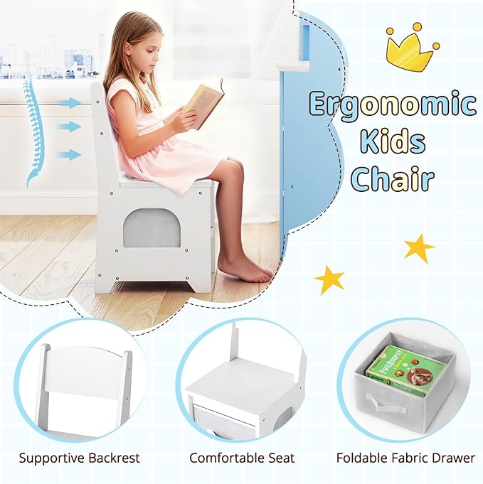 - Large Storage Capacity: To keep kid’s dressing area tidy, the vanity table is designed with a spacious desktop, 3 small shelves, and 5 open storage compartments to hold cosmetics, books, ornaments, etc. Plus, the matching chair comes with a foldable fabric drawer for extra storage space.