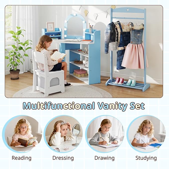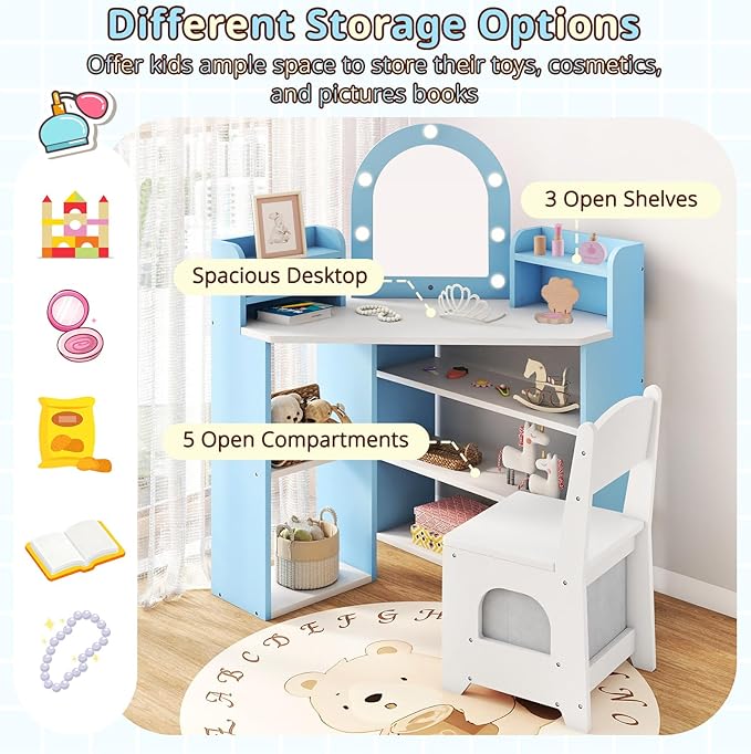 Costzon Kids Vanity with Lights, Corner Vanity Desk with Mirror, Storage Shelves, Wooden Princess Toddler Makeup Dressing Table, Kids Vanity Table and Chair Set for Little Girls (Blue)