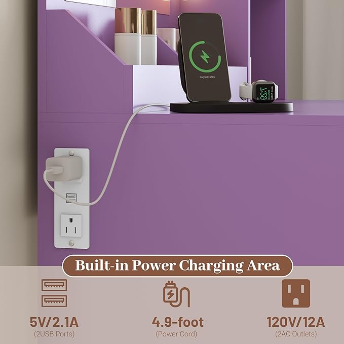 - 【Built-in Charging Station】 Designed for modern convenience, this vanity desk includes 2 AC outlets and 2 USB ports. Charge devices and power your beauty tools while keeping the tabletop organized and clutter-free.