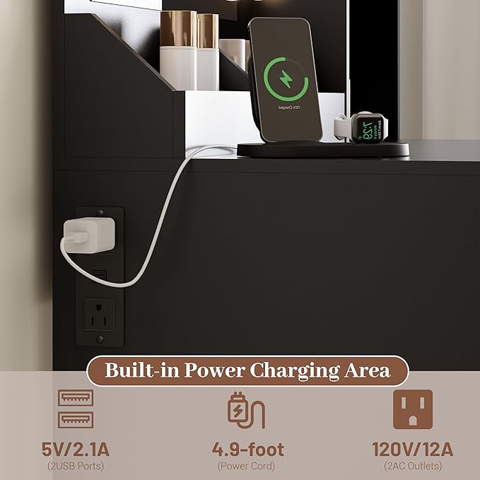 - 【Built-in Charging Station】 Designed for modern convenience, this vanity desk includes 2 AC outlets and 2 USB ports. Charge devices and power your beauty tools while keeping the tabletop organized and clutter-free.
