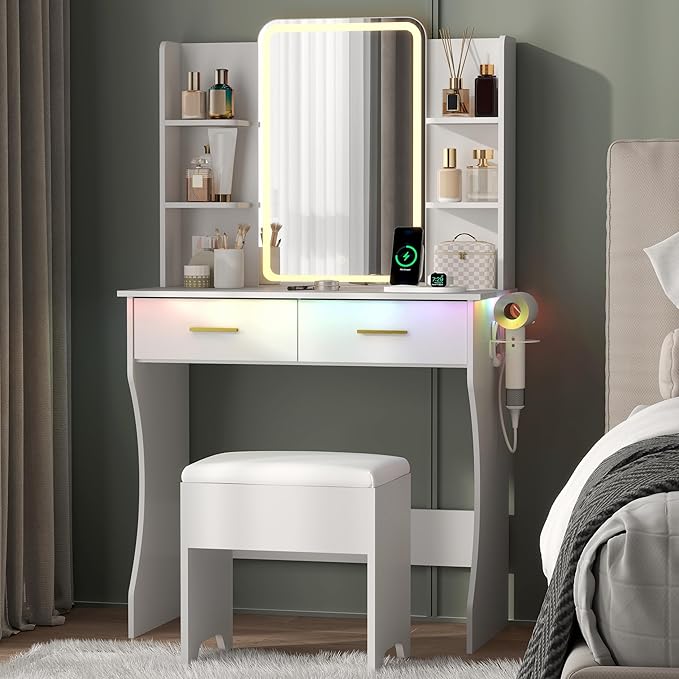 - LED Mirror with 3 Adjustable Light Modes: This vanity features a built-in LED mirror with warm yellow, natural, and bright white light modes, offering adjustable brightness to suit all your makeup needs. The soft, clear, and safe lighting ensures flawless application at any time of day, from natural daylight to cozy evening settings.