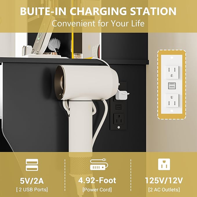 - Convenient Built-in Power Station & Hair Dryer Rack: The vanity includes a built-in charging station with 2 AC outlets and 2 USB ports, allowing you to charge and use devices simultaneously. It also comes with a dedicated hair dryer rack, keeping your styling tools like hair dryers and curling irons neatly organized and within easy reach, making your daily beauty routine effortless.