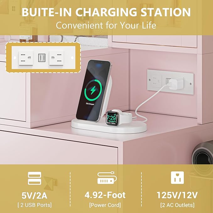 - 【Convenient Charging Station for Multi-Device Use】 Designed for modern living, the built-in power hub includes 2 AC outlets (125V 12A) and 2 USB ports (5V 2.1A), so you can easily power your phone, tablet, curling iron, or beauty tools all at once. A 4.92 ft power cord ensures easy access, keeping your space clutter-free and efficient.