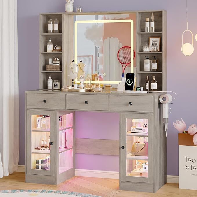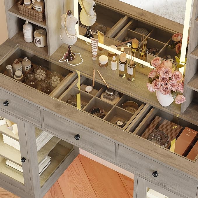 Makeup Vanity Desk with Mirror and Lights, 43" Grey Vanity with Glass Top, Jewelry Storage, 3 Drawers & Glass Cabinets, Power Outlet & Adjustable LED Lights, Dressing Table for Women & Girls Bedroom