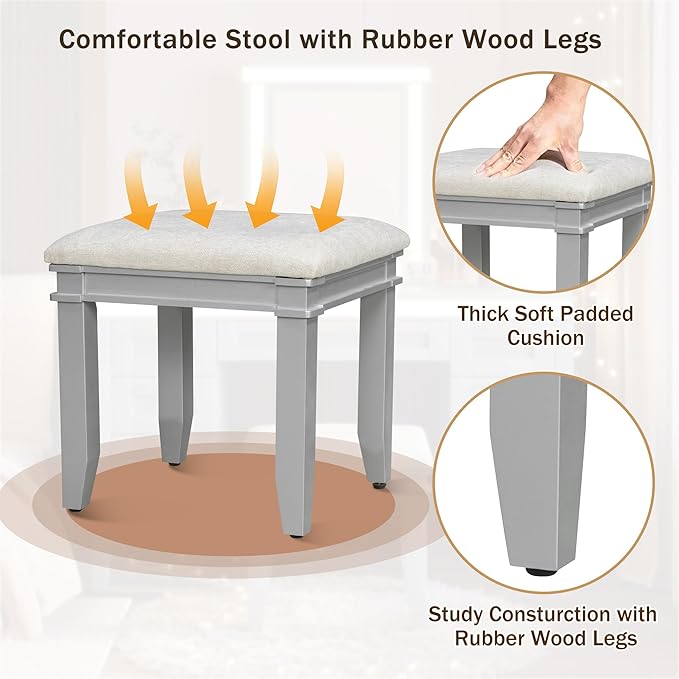 - Sturdy and Robust Construction: Built from high-quality wood, this vanity is made to withstand daily use while keeping its structure intact. The included stool is topped with a comfortable cotton-linen cushion, offering a supportive seat as you get ready.