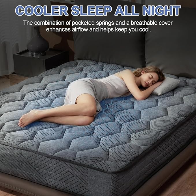 - Breathable Structure: This full size hybrid mattress features a premium knitted breathable fabric paired with a ventilated pocket spring system to improve airflow throughout the mattress. The breathable surface helps prevent heat buildup, keeps your sleep environment fresh and odor-free, and ensures a cool, comfortable night’s rest.