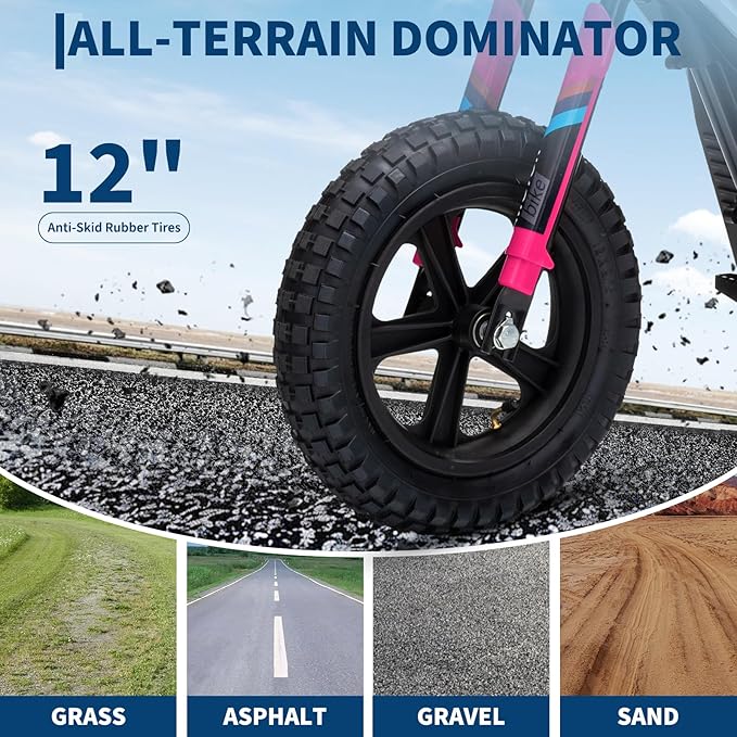 - Authentic Kids Dirt Bike Design – Experience real dirt bike performance with this electric motorcycle for kids, supporting riders up to 132 lbs. Its rear suspension handles shocks effortlessly, while the rear disc brake ensures smooth, precise stops. With a durable leather seat and 12-inch anti-slip rubber tires, young riders can confidently and excitedly tackle any terrain.
