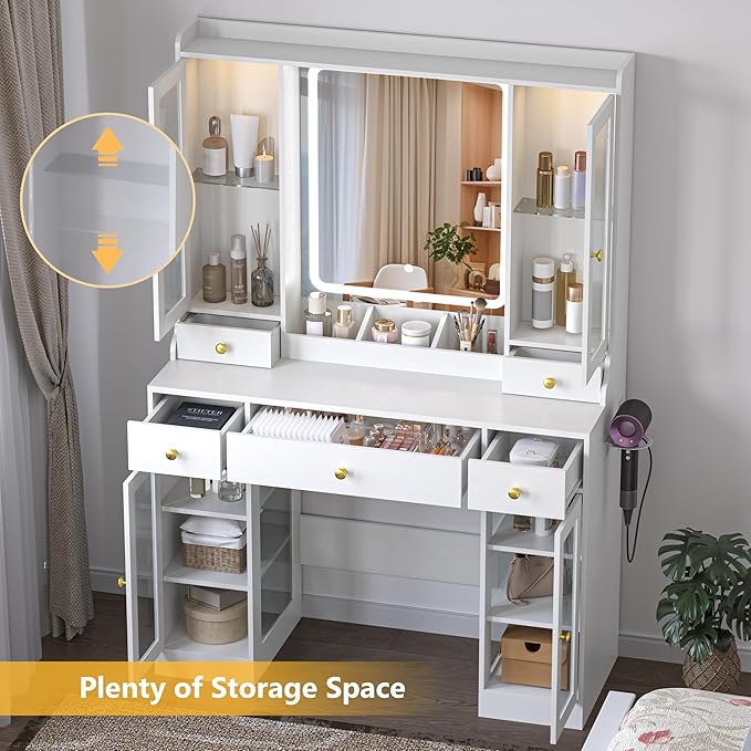 - 【41" Makeup Vanity Desk with 5 Drawers & 4 Glass Cabinets】This 41-inch makeup vanity set features 5 spacious drawers, 4 clear glass cabinets, and multiple open shelves—offering organized storage for makeup, skincare, jewelry, and beauty essentials. A perfect vanity desk for women and girls’ bedrooms