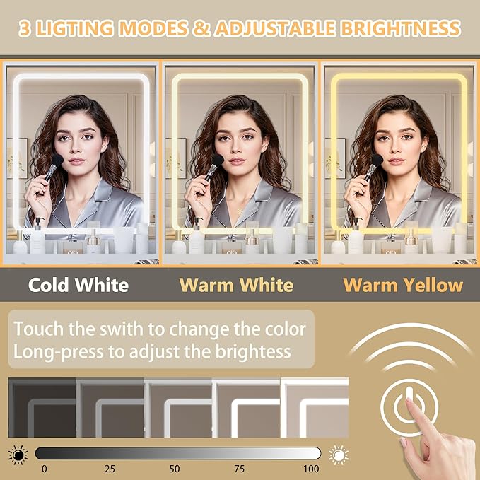 - 【Vanity with Mirror and Adjustable LED Lights】Equipped with bright LED bulbs and multiple color temperature modes, this vanity set with mirror and lights lets you adjust the brightness for flawless makeup application, skincare routines, live streaming, and daily styling