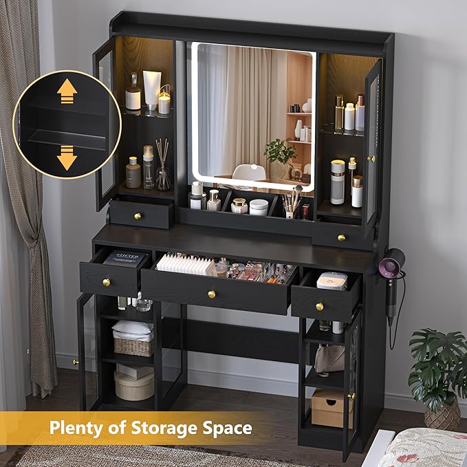 Makeup Vanity Desk with Mirror and Lights, 41" Black Vanity Set with 5 Drawers & 4 Glass Cabinets, Power Outlet & Adjustable LED Lights, Dressing Table for Women & Girls Bedroom