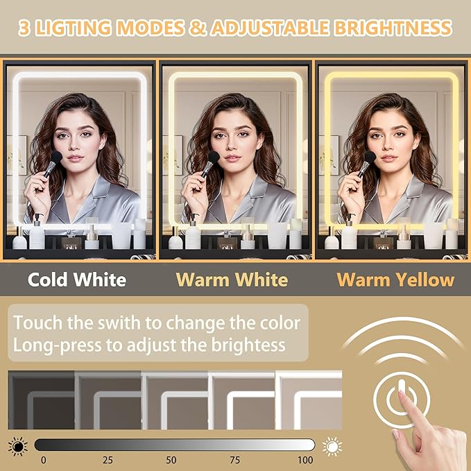 - 【Vanity with Mirror and Adjustable LED Lights】Equipped with bright LED bulbs and multiple color temperature modes, this vanity set with mirror and lights lets you adjust the brightness for flawless makeup application, skincare routines, live streaming, and daily styling