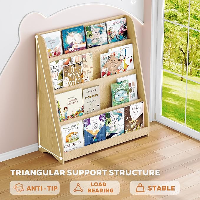 - 【Durable & Stable Toddler Bookshelf】This kids bookshelf offer the perfect hybrid solution for any child's room. Constructed from high-quality MDF, this 4-tier baby bookshelf features a solid triangular base for exceptional sturdiness, along with added anti-tip fittings. Its smooth rounded corner design and kid-friendly height make this book shelf for kids rooms ideal for young children.